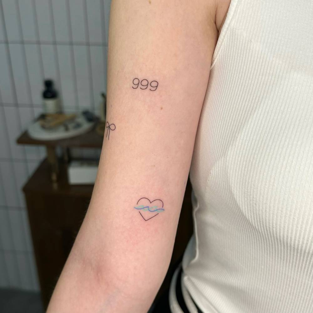 Minimalistic style wave and heart tattoo located on the inner arm. Fuente