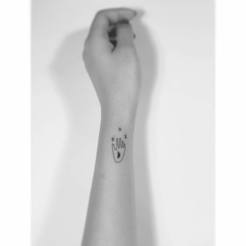 Hand and stars tattoo in minimalistic style located on the wrist. Fuente