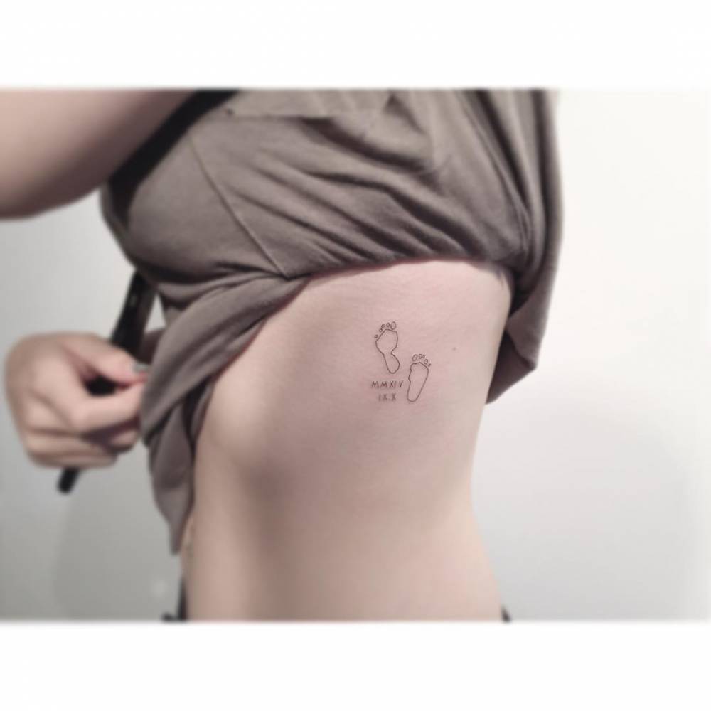 Baby footprints tattoo in minimalistic style located on the rib. Fuente